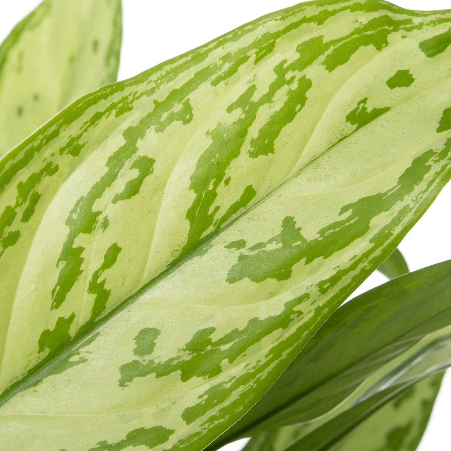 Net als de Dieffenbachia, Monstera en de Philodendron is deze Aglaonema een familielid van de aronskelkachtigen. Het blad is zeer decoratief en heeft vele soorten. Dit soort heeft donkergroen blad met lichtgroene nerven. De bladstelen van deze plant zijn wit, wat een fris uiterlijk geeft.