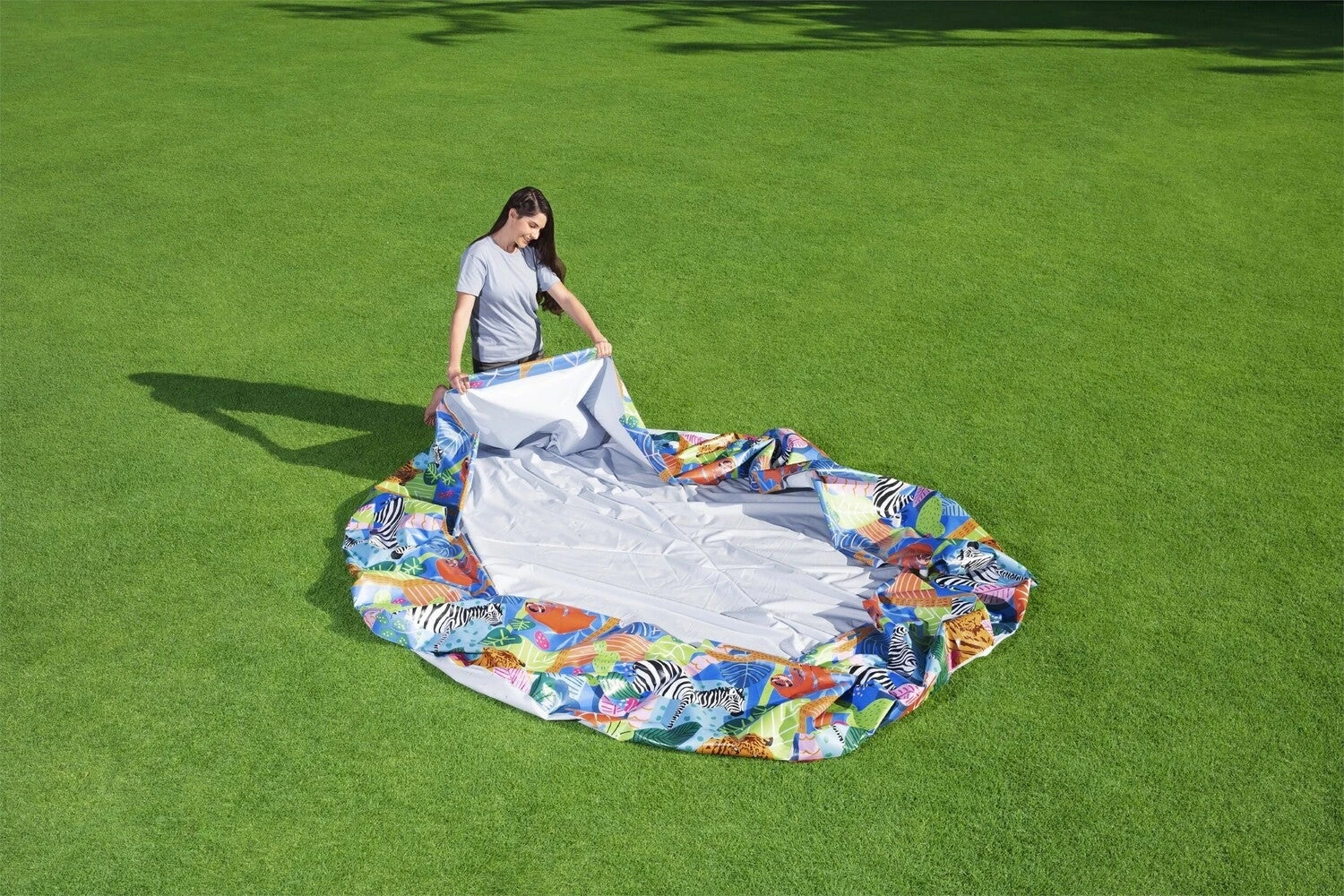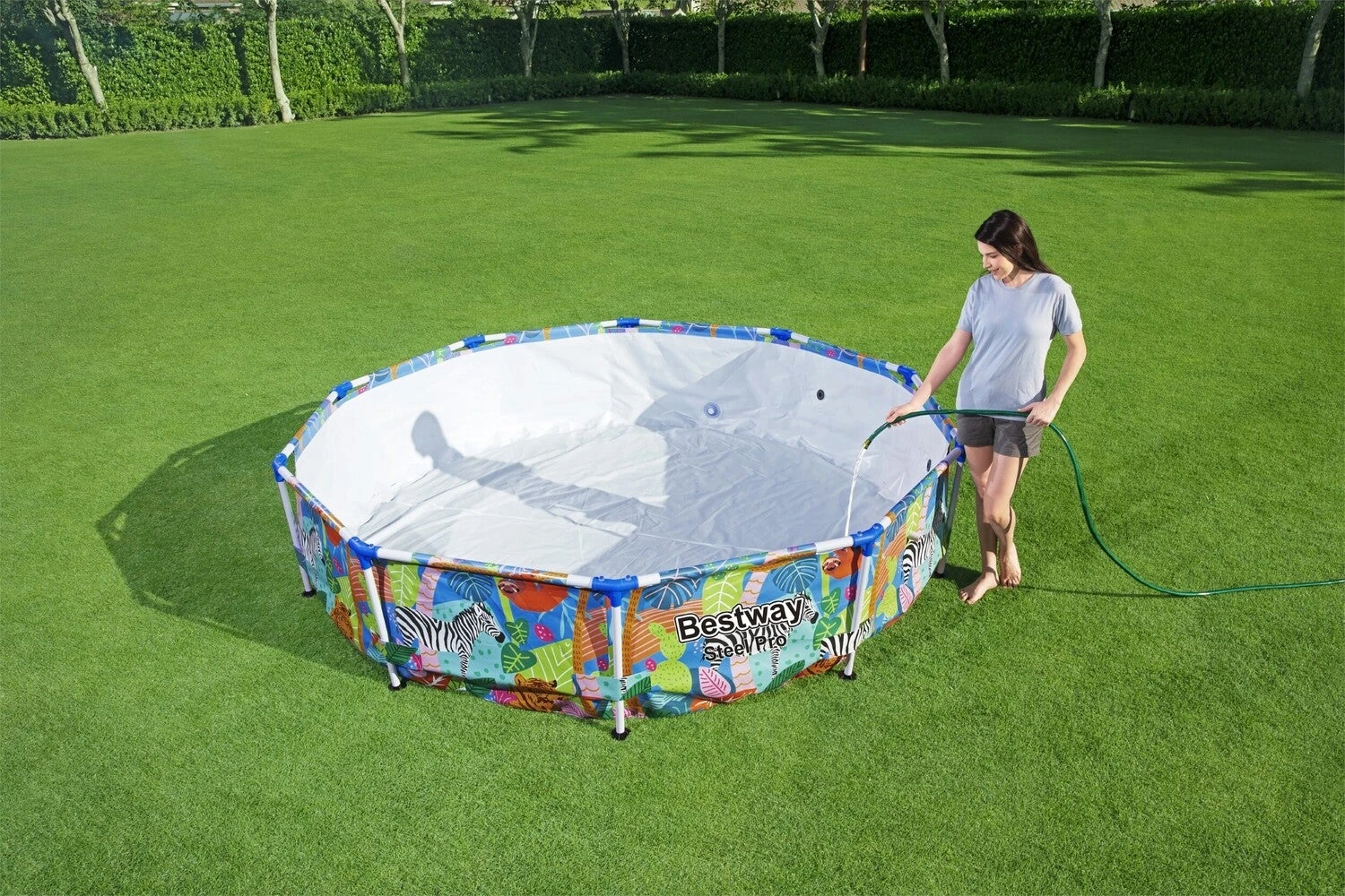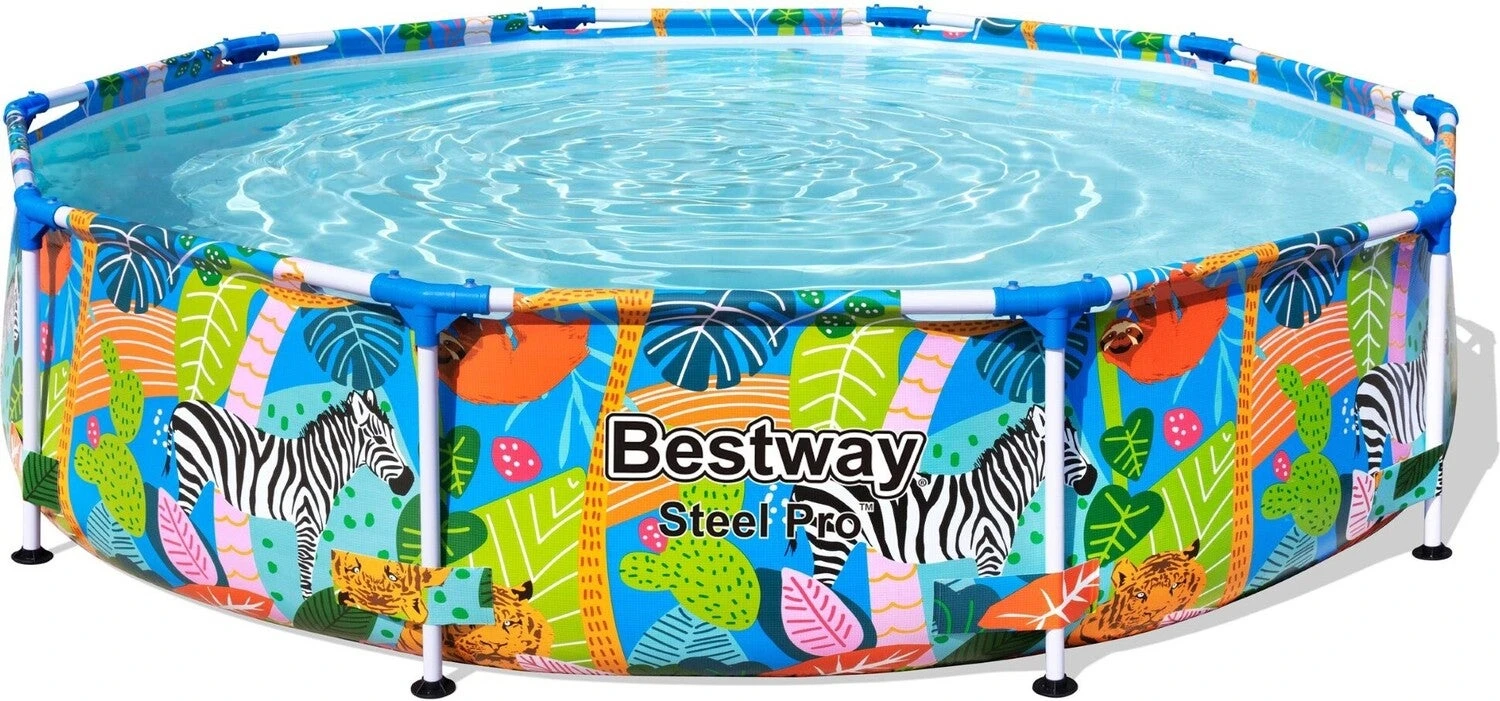 Zoek jij een stevig zwembad wat wel de hele zomer kan blijven staan? Dit kinderzwembad van Bestway kan wel tegen een stootje! Het zwembad heeft een rond roestbestendig stalen frame met een kleurrijke jungleprint. Het bad is gemakkelijk op te zetten zonder verder gereedschap te gebruiken en gemaakt van duurzaam Tritech materiaal. Het zwembad is onderaan voorzien van een PVC band voor extra versteviging.