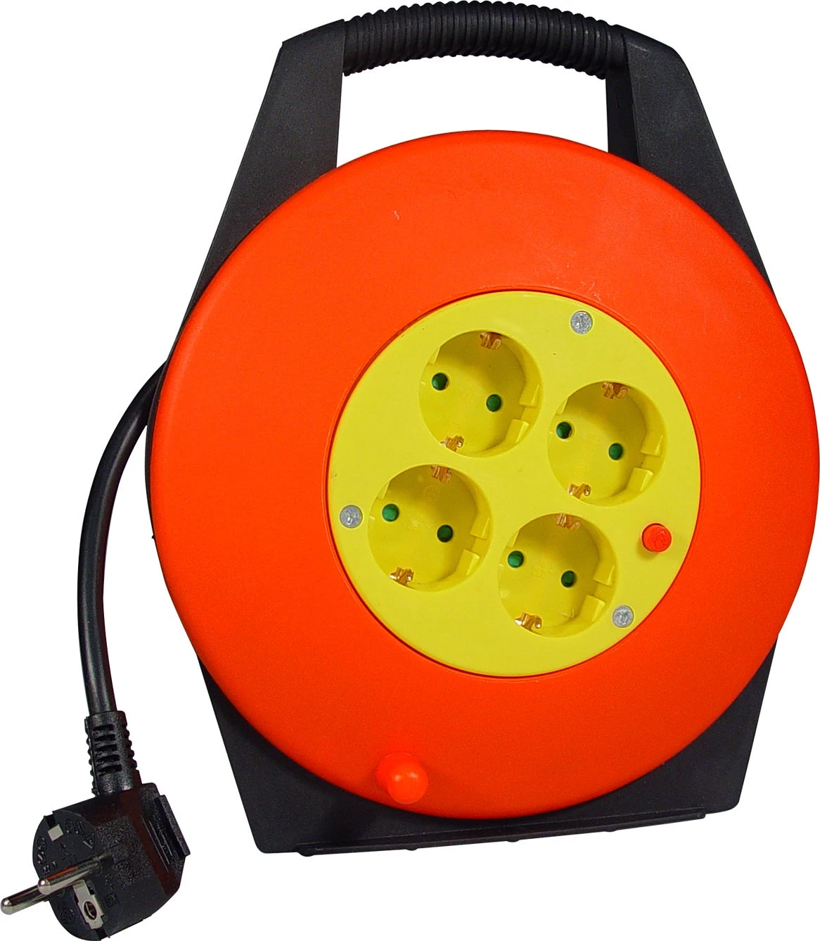 De zwarte Calex kabelhaspel heeft een vier geaarde aansluiting. Door het handvat is hij gemakkelijk mee te nemen. De kabellengte bedraagt 10mtr.