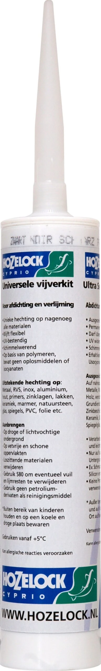 De universele vijverkit van Hozelock is geschikt voor verlijming en afdichting. Op basis van MS polymeren, waardoor het dus geen oplosmiddelen bevat of voor vijverbewoners schadelijke isocyanaten. Met een 34 kg trekkracht per cm² (regulier = maximaal 15 kg per cm²) heeft deze vijverkit een uitstekende hechting op vrijwel elke ondergrond zoals metaal, RVS, inox en aluminium, hout, kunststoffen, PVC en (rubber) folie, primers, zinklagen en lakken, keramiek, marmer en natuursteen, glas en spiegels. Hozelock vijverkit is schimmelwerend, UV-bestendig, overschilderbaar en blijvend flexibel. De inhoud is 290 ml.