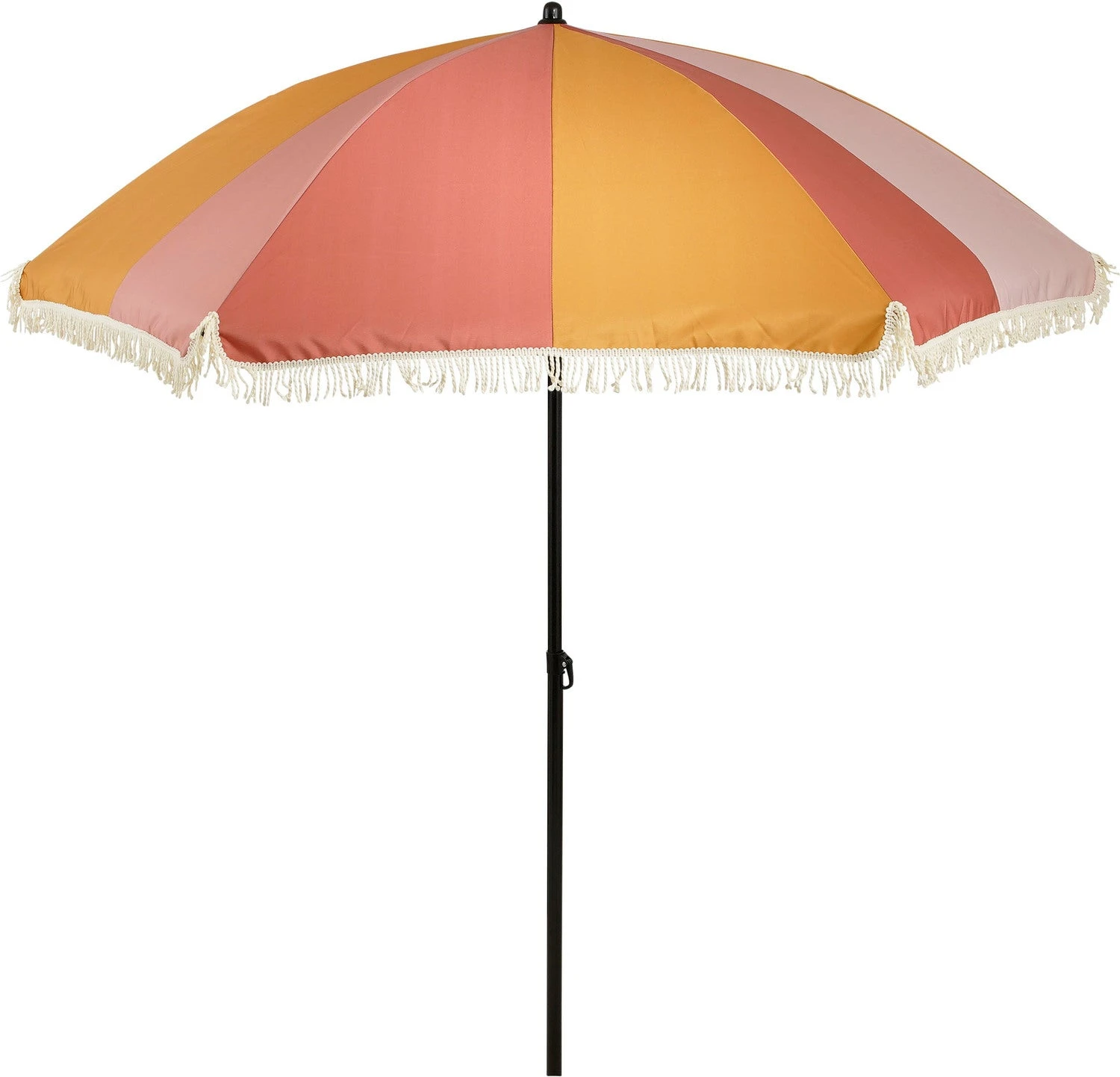 Bescherm jezelf tegen de zon met deze vrolijke parasol van In The Mood Collection. Dankzij de gekleurde en groene strepen zit je er zelfs in de schaduw nog steeds zonnig bij. De parasol met franjes is gemaakt van hoogwaardige polyester stof.