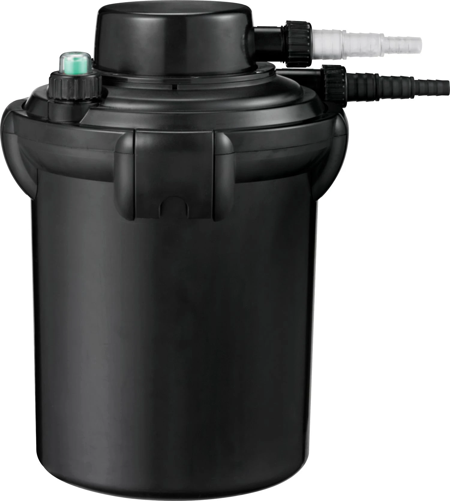 Plaats de drukfilter buiten de vijver, hij mag ook gewoon worden ingegraven. Verbind hem met de vuilwaterpomp in de vijver. De geïntegreerde UVC lamp bestaat uit een ultraviolet lamp waarlangs het water stroomt. De straling van de lamp doodt zweefalgen en verwijdert organisch vuil waardoor het water weer helder en gezond wordt en vervolgens ook blijft.