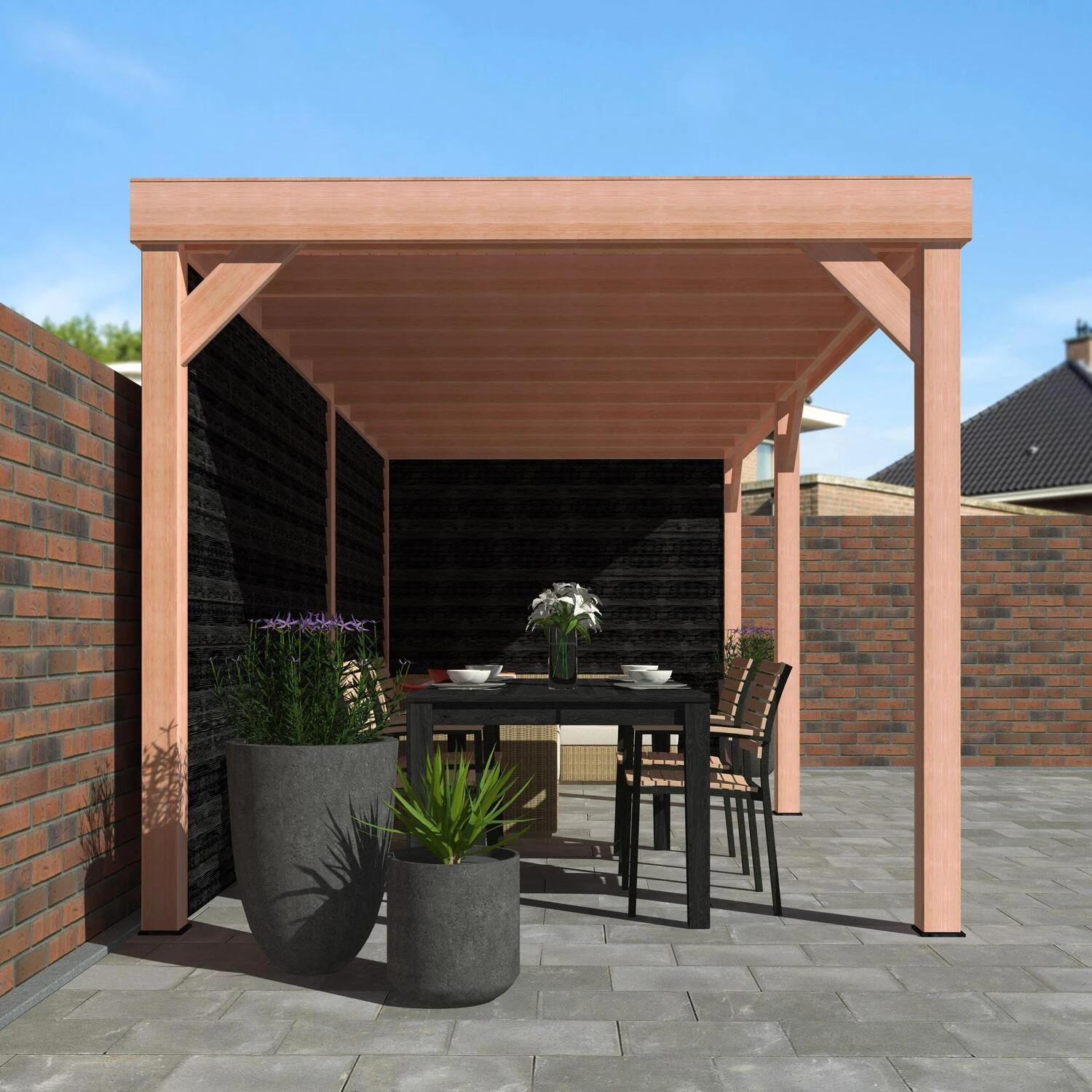 Deze terrasoverkapping is een toegevoegde waarde voor iedere tuin. De karakteristieke look die Douglas hout jouw tuin in brengt zorgt voor een natuurlijke en vooral sfeervolle uitstraling. Het Douglas hout is een sterke soort tuinhout dat van nature goed bestand is tegen vuil en vocht. Dit hout gaat zonder extra behandeling eenvoudig 10 tot 15 jaar mee. Deze houten overkapping heeft afmetingen van 270 x 582 x 247 cm en wordt geleverd inclusief EPDM-folie voor een waterdichte dakbedekking. Het totaalpakket staat extra stevig dankzij de achterwand, zijwand en de 12 x 12 cm Douglas palen.