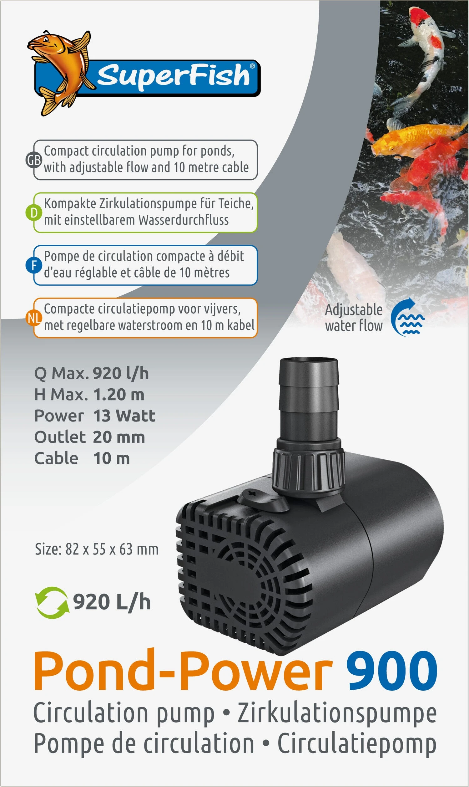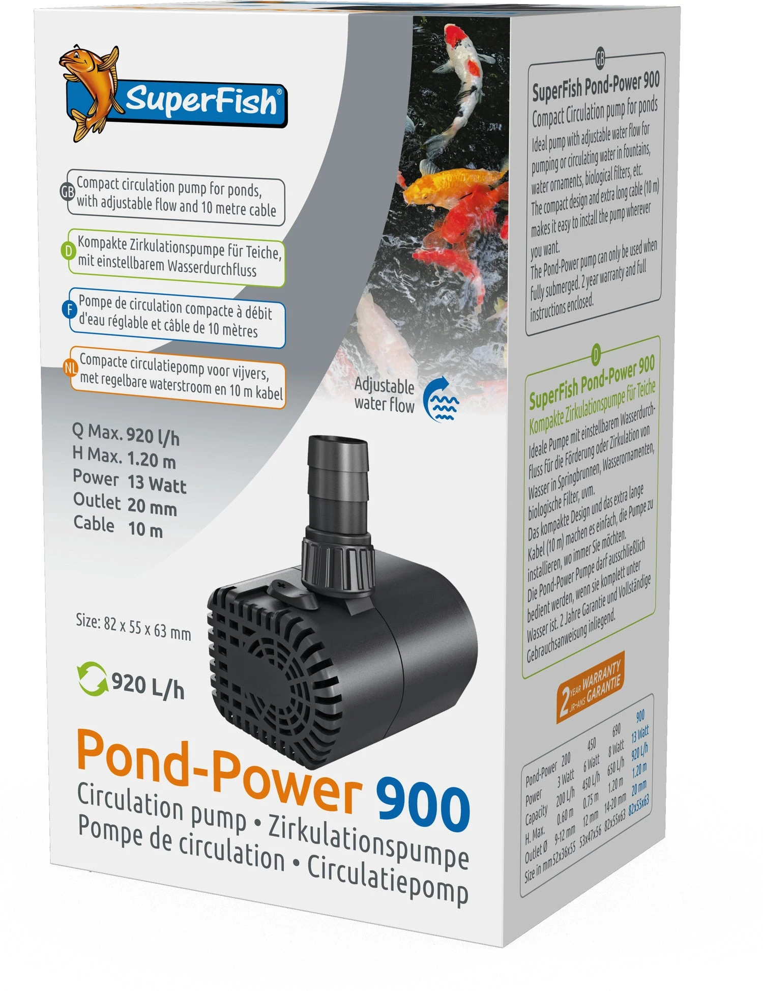 SuperFish Pond-Power circulatiepompen zijn ideaal voor het opvoeren of circuleren van water in fonteinen, waterornamenten, biologische filters, etc. PompÂcapaciteit van 900 L/h. Compact ontwerp, waardoor de pomp eenvoudig overal te installeren is. Gemaakt om volledig onderÂgedompeld te worden gebruikt. Voorzien van een extra lange kabel (10 meter). 2 jaar garantie en een uitgebreide gebruiksaanwijzing.