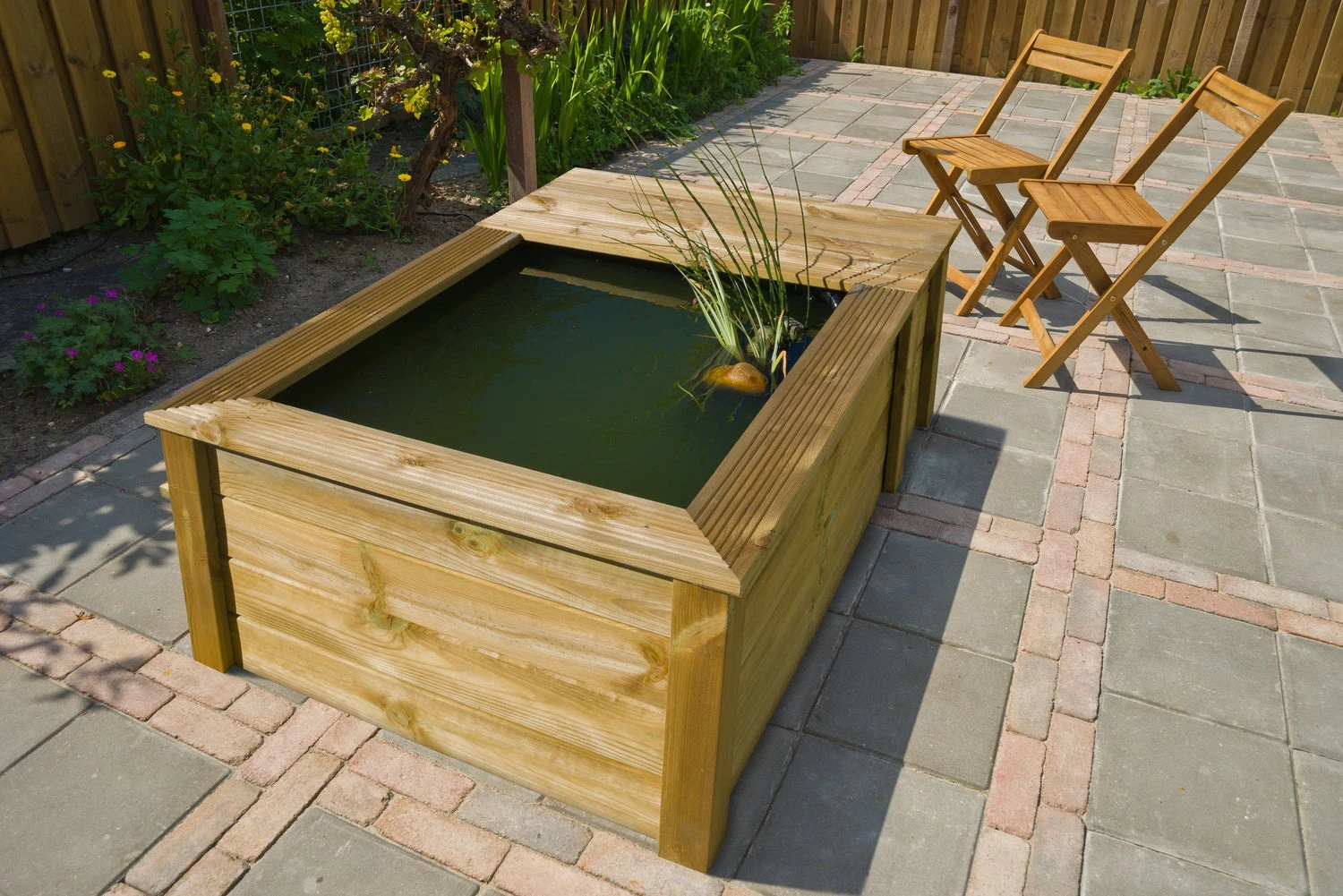 De vijverrand Quadro Wood 3 van Ubbink is een vijverset die bestaat uit een houten vijverrand en vijverfolie. De terrasvijver met geïntegreerde filterkast is geschikt voor Victoria Quadro 6.