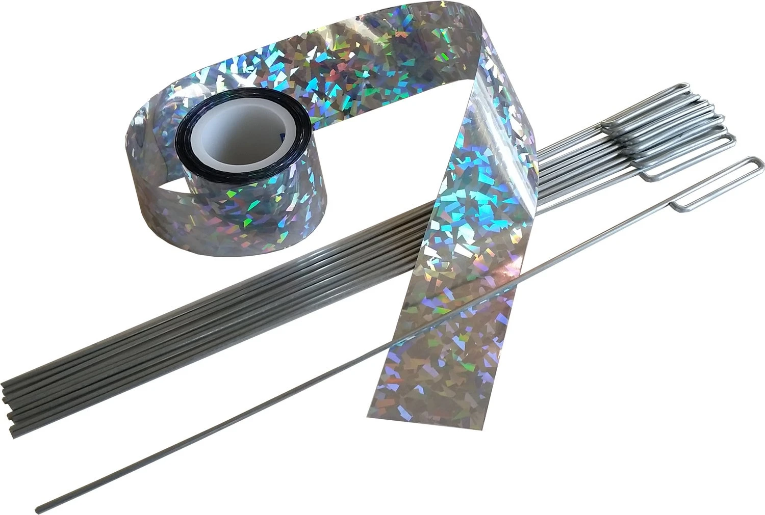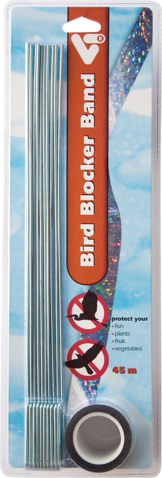 Vogels en reigers zijn verblind door de reflecties van de Bird Blocker Band van VT en blijven uit de buurt. De vogelverschrikker set bestaat uit 45 meter speciale holografische band en 10 metalen grondpennen, om een omheining te maken om de vijver of de groentetuin te maken. Het kan ook in een boom hangen om bijvoorbeeld vogels weg te houden van fruitbomen.