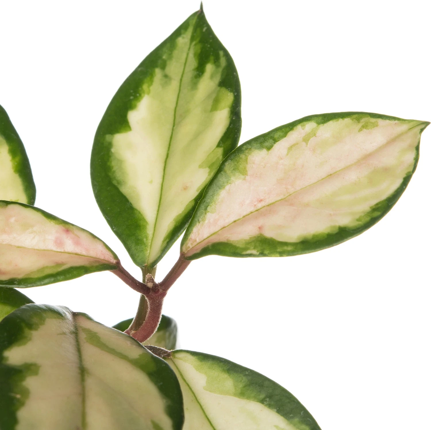 Langs hangende uitlopers zal de hoya stervormige bloemen in een scherm vormen. Deze bloemen geuren behoorlijk en niet iedereen kan deze intense geur genieten. Het blad van deze schoonheid heeft drie kleuren, groen, geel en licht roze.